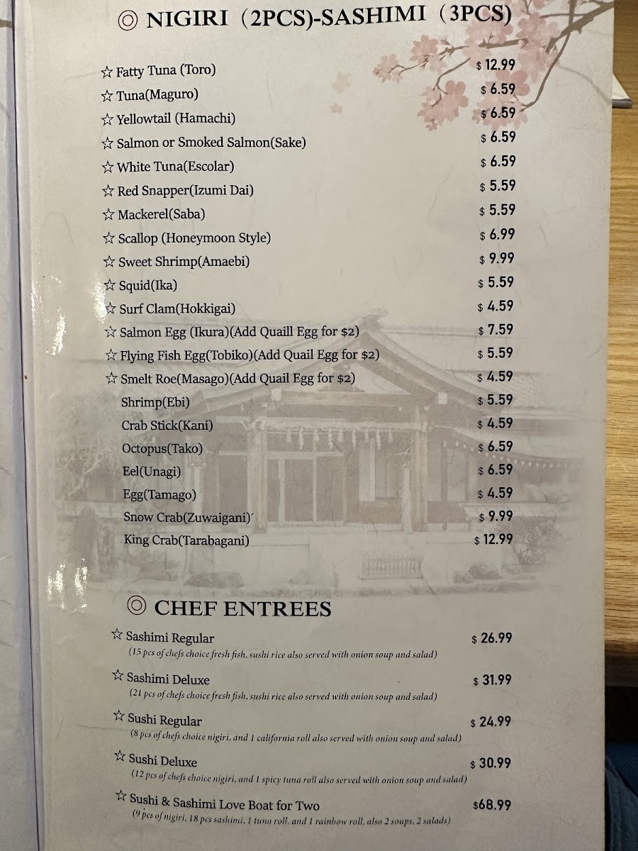 12 pieces of chef's choice nigiri and 1 1 spicy tuna roll, also. Served with onion soup and salad.